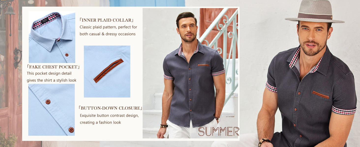 - Plaid Design – Plaid design on neck short sleeve casual work shirt for men, high quality casual cotton denim button-down dress shirt, and short sleves jean shirts for men make you handsome and comfortable.